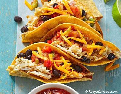 3.املت به دست آمده را داخل نان های ترتیلا بگذارید. روی آنها لوبیا و 4 قاشق سالسای باقی مانده را بریزید. در آخر پنیر روی آن بریزید و در صورت تمایل با پوست رنده شده لیمو سرو کنید.
