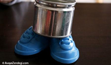 کفشهای عروسکی که در اینجا استفاده کردیم، به کاملتر و شخصیت دار شدن طرح کمک میکند و علاوه بر آن آبی که داخل سبزه ها ریخته میشود و از قوطی خارج میشود را در خود نگه می دارد.
