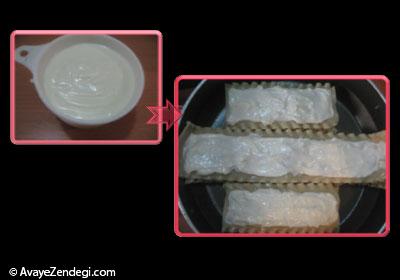 آرد را در یک ظرف تفلون ریخته، شیر را کمکم اضافه کرده هم میزنیم.