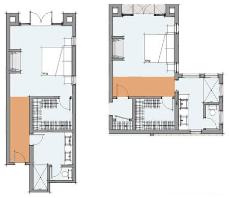 برای صرفه جویی در فضا، به محل قرار دادن سرویس بهداشتی و کمد و اتاق لباس توجه کنید. اتاق هایی که در آنها دسترسی به سرویس بهداشتی و اتاق لباس قبل از فضای خواب است، به راهروی طولانی تری نیاز دارند (پلان سمت چپ). اگر دسترسی به این فضاها از بخش خواب است، به راهرو نیازی نیست و در عوض شما باید سیرکولاسیون حرکتی را در فضای اتاق خواب ایجاد کنید تا بزرگ تر نیز به نظر برسد (پلان سمت راست).