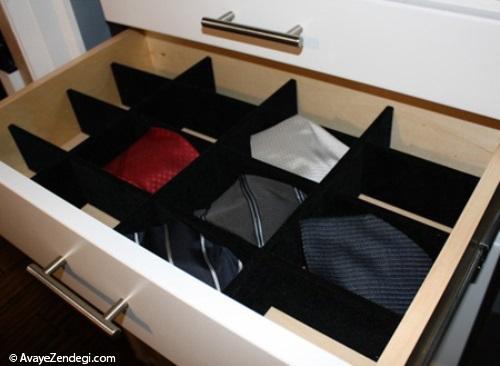 یکی راه حل مقرون به صرفه ی دیگر برای نظم بخشیدن به کروات ها و کمربندهای شما استفاده از جعبه تقسیم هاست، به سادگی می توانید فضای کشوهای خود را برای این منظور تقسیم بندی کنید و به وسایل خود نظم و ترتیب ببخشید.
