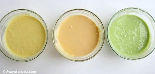 2. خمیر کیک را در سه کاسه تقسیم کنید. در یک کاسه لایه زرد را با اضافه کردن زرده یک تخم مرغ بدست آورید. در کاسه دیگر، آب هویج را بریزید تا خمیر نارنجی شود و در نهایت آب اسفناج را به کاسه سوم اضافه کنید تا خمیر سبز شود.