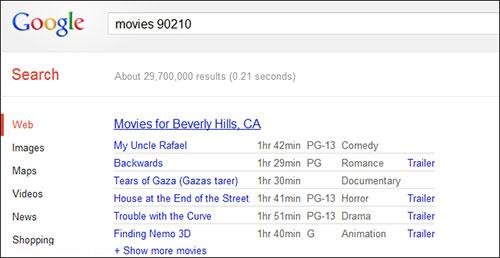 امکان جالب دیگری که گوگل در اختیار کاربرانش قرار داده است برنامه ی فیلم های سینماهاست . شما با تایپ کلمه ی movies و سپس کد پستی تان می توانید از آخرین فیلم هایی که بر روی سینماهای محل زندگی شما قرار دارد با خبر شوید .