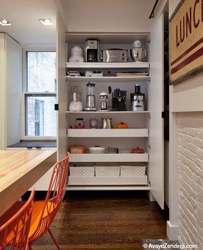 اگر یك كابینت بزرگ یا انباری در آشپزخانه ندارید از قسمتی از یك كابینت مرتفع استفاده كنید. درهایی به این كابینت اضافه كنید كه كاملا از جایشان خارج شوند و این وسایل را در درون یك قفسه كشویی قرار دهید تا به راحتی به آن‌ها دسترسی داشته باشید.