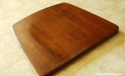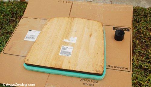 مقوای محکمی را زیر نشیمنگاه چوبی که از صندلی جدا کرده اید، بگذارید و آنرا ببرید، دقت کنید که مقوا کاملا اندازه نشیمنگاه نباشد و کمی از اطراف با آن فاصله داشته باشد.