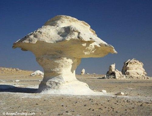 بیابان سفید، در حدود 500 کیلومتری جنوب غربی قاهره، پوشیده از ترکیبات آهک و گچ است که باد و ماسه اشکالی عجیب را در آن به وجود آورده است.
